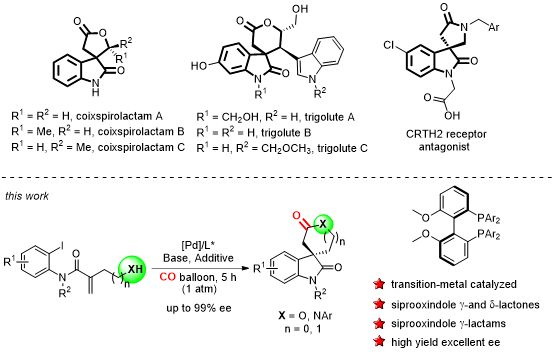 實現(xiàn)了鈀催化的不對稱Heck/羰基環(huán)化反應,發(fā)展了合成手性季碳氧化吲哚螺內酯/內酰胺的通用方法(2019,Angew.Chem.Int.Ed.)。