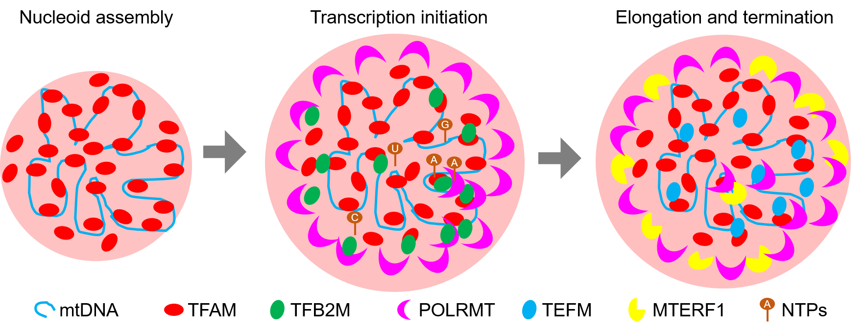 提出TFAM-mtDNA共相分離介導(dǎo)線粒體類核自組裝新模型,發(fā)現(xiàn)多相相分離介導(dǎo)類核多層結(jié)構(gòu)形成,并調(diào)控線粒體轉(zhuǎn)錄的新機(jī)制(2021,Nature Structural & Molecular Biology)。
