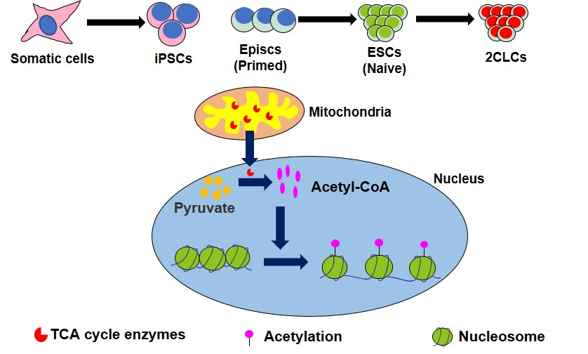 TCA循環(huán)酶類(lèi)在多能干細(xì)胞獲得、Primed-Na?ve轉(zhuǎn)變過(guò)程以及ESCs-2CLCs轉(zhuǎn)變過(guò)程中存在從線粒體向細(xì)胞核轉(zhuǎn)運(yùn)的現(xiàn)象(2022,Nature Communications)。
