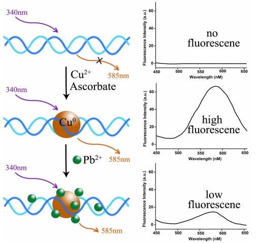 廣州生物院曾令文研究組采用隨機雙鏈DNA為模板,在銅離子和還原劑存在的情況下合成了穩(wěn)定的熒光銅納米顆粒,并成功構建了生物傳感器用于痕量鉛離子的快速檢測。鉛離子能夠選擇地淬滅熒光銅納米顆粒的熒光,并且隨著鉛離子濃度的增加,熒光強度下降,從而達到檢測鉛離子的目的。