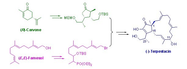 (?)-Terpestacin的主體結構是五員環(huán)和十五員大環(huán)反式稠合(即[3,0,13]雙環(huán)骨架體系)而成的萜類化合物,大環(huán)上有三個反式三取代雙鍵。共有四個手性中心(即C1, C11, C15, C23), 其中C1 位是季碳手性中心。五員環(huán)為官能團密集的1,2-雙酮結構,其中一個羰基呈現烯醇式結構。該分子的以上結構特征,使得該分子進行全合成具有較大的挑戰(zhàn)性。鑒于上述生物活性和結構特點,該分子已成為許多世界著名大學(包括哈佛大學、斯坦福大學、麻省理工學院等)的著名學者的研究對象。目前文獻中已有六個研究組完成了該分子的合成(含四條不對稱合成路線),但合成步驟較長。