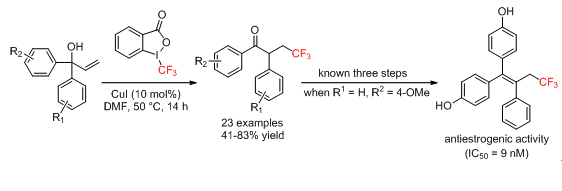 中科院廣州生物院吳筱星課題組與西安交通大學李鵬飛課題組合作,成功地實現(xiàn)了對a,a-二芳基烯丙醇的銅催化三氟甲基化誘導的1,2-芳基遷移反應。并通過對不對稱底物反應的研究,闡明了該類反應是通過三氟甲基自由基的機理進行的,從而為設計新型三氟甲基化反應提供了重要的依據(jù)。此外,通過該方法能合成一系列其它途徑難以獲得的b-三氟甲基芳基酮化合物,并可用于制備具有顯著抗雌激素活性的化合物。目前,相關成果已被《德國應用化學》雜志接收并在線發(fā)表(Angew. Chem. Int. Ed. 2013, 52, early view. DOI: 10.1002/anie. 201302673)。