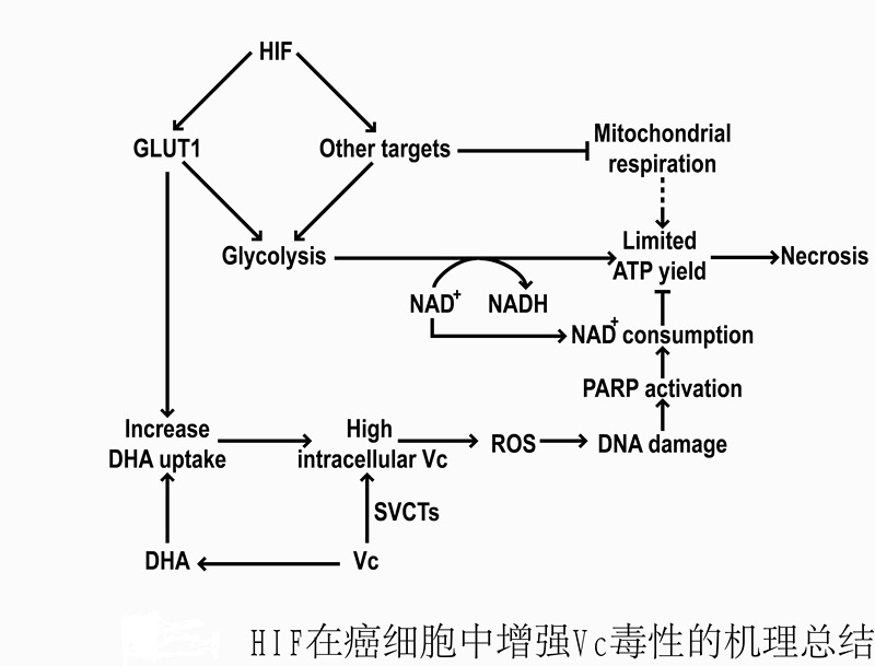 該研究團隊以腎透明型腎癌細胞(CCRCC)作為腫瘤細胞研究模型,通過研究維生素C對腎癌細胞產(chǎn)生細胞毒性的機理,發(fā)現(xiàn)維生素C可以通過依賴低氧誘導(dǎo)因子(HIF)介導(dǎo)細胞死亡,且這一現(xiàn)象也被廣泛發(fā)現(xiàn)于其他癌細胞中。以此為切入點進一步發(fā)現(xiàn),HIF陽性的腎癌細胞可以通過腫瘤細胞普遍高表達的葡萄糖受體GLUT1在胞內(nèi)累積更多的維生素C,并與胞內(nèi)的鐵離子反應(yīng)產(chǎn)生更多的活性氧基團(ROS),進而誘發(fā)嚴重的DNA損傷。細胞對DNA損傷的修復(fù)會大量消耗胞質(zhì)內(nèi)的NAD+,由于HIF陽性的腎癌細胞通過“Warburg 效應(yīng)”依賴低效率的糖酵解途徑獲取能量,其對NAD+驟降的緩沖能力較弱,細胞因此不可逆的走向了壞死。