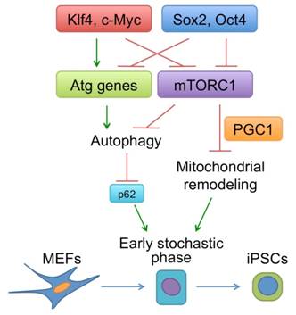 圖:重編程因子如何調節(jié)自噬和mTORC1以及后兩者如何影響體細胞重編程。圖片摘自http://www.nature.com/ncb/