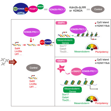 陳捷凱博士等人在2011年曾報(bào)道BMP信號可以顯著促進(jìn)Oct4單因子誘導(dǎo)的iPS細(xì)胞形成,因此在該研究中,研究人員希望結(jié)合BMP信號和KDM2B來獲得更高效的Oct4單因子重編程,出乎意料的是,兩者同時(shí)使用時(shí),重編程效率比單獨(dú)加其中任何一者都要更低,這提示BMP信號會(huì)對KDM2B-PRC1進(jìn)行調(diào)節(jié)。研究人員使用KDM2A和KDM2B-ΔLRR作為對照,證明PRC1的招募能力是出現(xiàn)這一抑制因素的原因。進(jìn)一步的ChIP-seq實(shí)驗(yàn)表明,加入BMP后,KDM2B、H2AK119泛素化在CGI區(qū)的水平出現(xiàn)了顯著的下降,后續(xù)研究表明,BMP下游的Smad1蛋白可以與KDM2B相互作用,并導(dǎo)致KDM2B在染色質(zhì)上的結(jié)合能力下降。這種KDM2B-PRC1的結(jié)合削弱會(huì)導(dǎo)致顯著的中內(nèi)胚層基因表達(dá),從而改變了細(xì)胞的命運(yùn)走向。