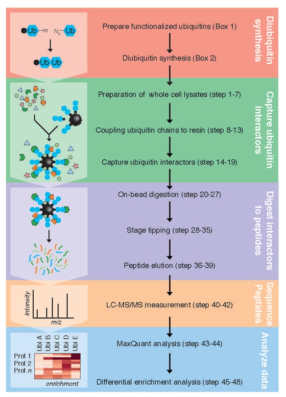 而在本次論文中,張小飛研究組與荷蘭內(nèi)梅亨大學(xué)共同發(fā)表了一篇詳細(xì)介紹該方法的指南。論文介紹,UbIA-MS方法分為五個步驟。首先,點(diǎn)擊化學(xué)合成不被去泛素化酶水解的泛素鏈;其次,體外親和并純化與泛素相互作用的蛋白;再次,將與柱子相互作用的蛋白消化為多肽;然后,運(yùn)用液相色譜(LC)-質(zhì)譜MS / MS進(jìn)行分析;最后,通過數(shù)據(jù)分析以鑒別富集的蛋白質(zhì)的差異。