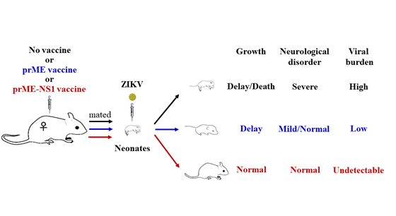 當(dāng)前寨卡病毒疫苗的設(shè)計主要以包膜蛋白(envelope, E)為抗原靶標(biāo),前體膜蛋白(pre-membrane, prM)作為伴侶蛋白也常納入疫苗設(shè)計。非結(jié)構(gòu)蛋白1(non-structual protein 1,NS1)雖然在寨卡病毒復(fù)制、致病中起關(guān)鍵作用,但尚無研究以其作為抗原靶標(biāo)。本研究中,研究人員以復(fù)制缺陷型2型腺病毒作為載體,探索了僅攜帶E,攜帶prM、E,攜帶prM、E以及NS1的三種疫苗策略。結(jié)果發(fā)現(xiàn)含NS1抗原組份的疫苗策略不僅在母鼠中有效抵御病毒血癥,還能保護新生鼠免受寨卡病毒感染導(dǎo)致的體重減少、神經(jīng)癥狀等,顯著抑制病毒對新生鼠的感染。該研究表明prM、NS1的納入可顯著提升免疫保護效果,提示NS1可以做為寨卡病毒疫苗的抗原組份,值得進一步評估和開發(fā)。