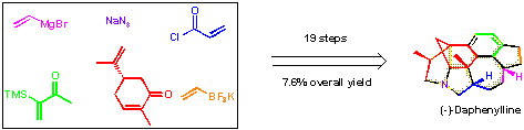 該研究成果的亮點在于以價廉易得的天然手性源(S)-Carvone為起始原料,運用簡單的合成砌塊,以極好的立體選擇性,簡潔、高效地實現(xiàn)了(-)-Daphenylline的全合成。關(guān)鍵步驟包括Mg(ClO4)2催化的酰胺環(huán)化, Diels?Alder 環(huán)加成反應(yīng),Robinson環(huán)化/芳構(gòu)化,Friedel–Crafts環(huán)化。該成果發(fā)表在Angew. Chem. Int. Ed.上(DOI: 10.1002/anie.201902268)。