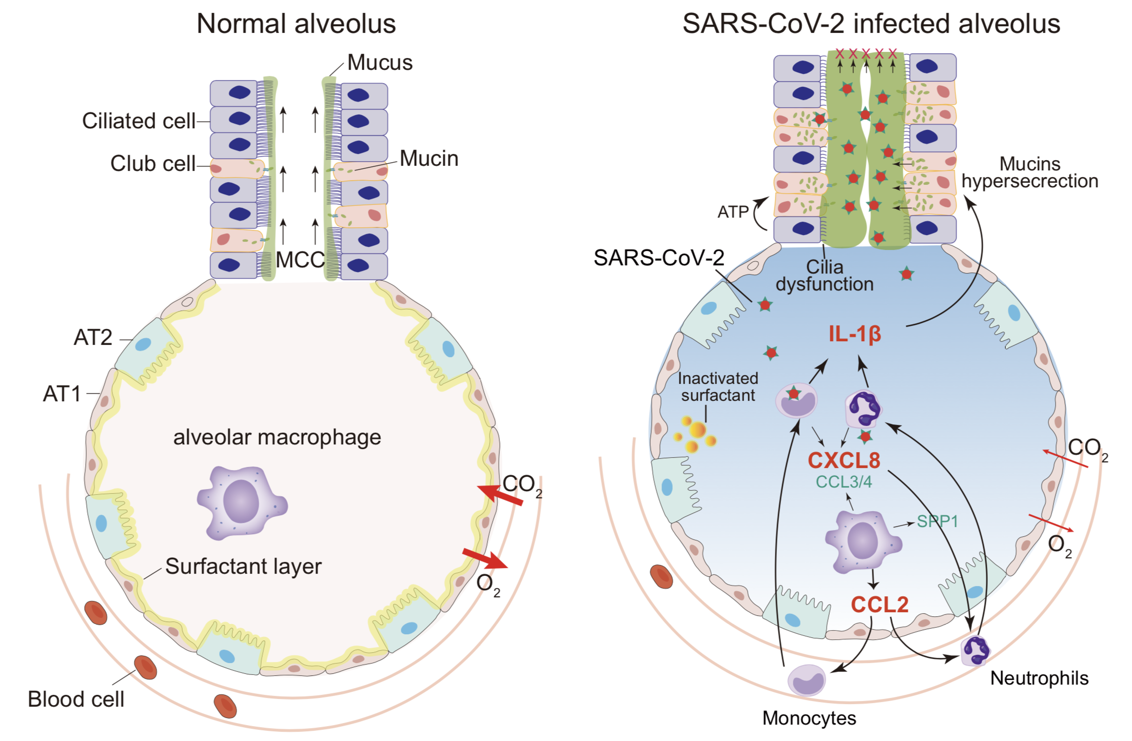 肺是新冠病毒感染的主要器官,目前大部分新冠病人的直接死因源于呼吸衰竭導(dǎo)致的急性呼吸窘迫癥(ARDS)。ARDS是新冠危重癥患者的主要病癥,同時(shí)病程極長,導(dǎo)致重癥監(jiān)護(hù)室(ICU)資源急劇耗盡,因此,新冠危重癥的ARDS病理機(jī)制研究對于有效應(yīng)對疫情具有重要意義。臨床檢測及尸檢結(jié)果表,重癥新冠病人病毒感染后會(huì)刺激肺產(chǎn)生大量凝膠狀流動(dòng)性極差的粘液,這些粘液會(huì)堵塞支氣管甚至肺泡,使正常呼吸氣體交換受阻,是造成重癥患者ARDS的重要原因之一。目前,新冠病人粘液從何而來并不清楚,因此,了解新冠病人粘液產(chǎn)生的來源及原因?qū)εR床治療具有重要指導(dǎo)意義。