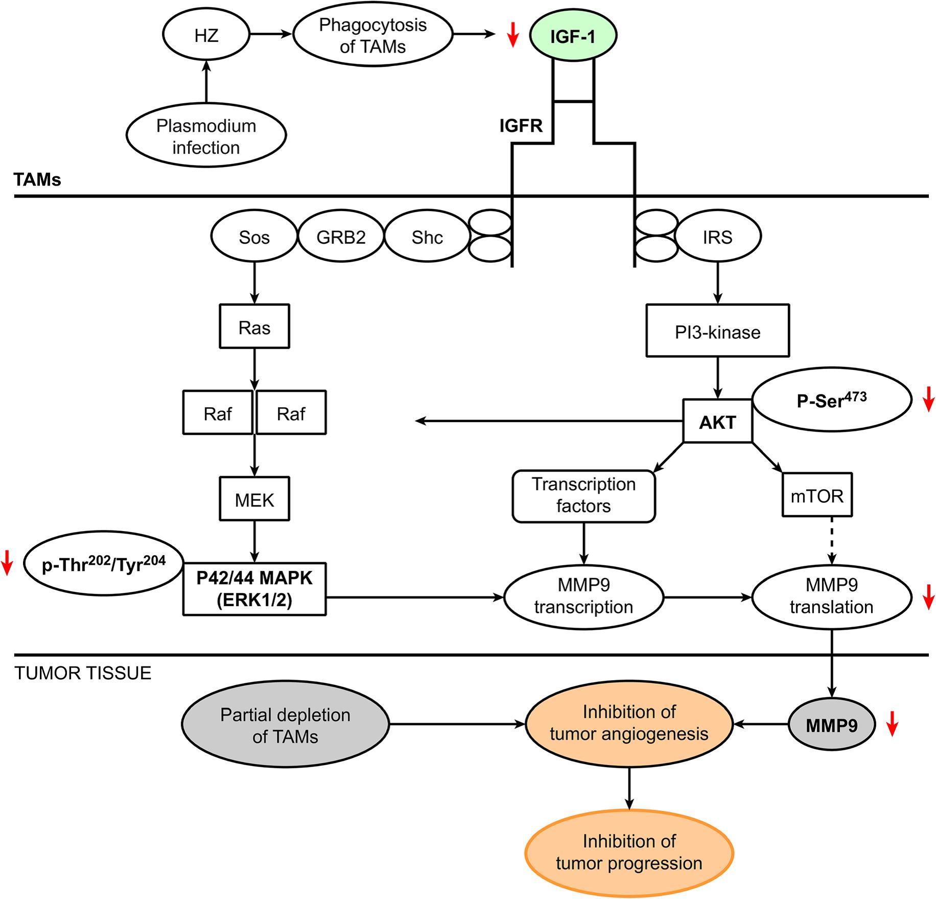 陳小平團(tuán)隊(duì)發(fā)現(xiàn),TAMs的數(shù)量及其產(chǎn)生的基質(zhì)金屬蛋白酶9(MMP-9)有助于腫瘤組織中的腫瘤血管生成,而瘧原蟲感染能下調(diào)TAMs中的MMP-9表達(dá)量,從而抑制腫瘤血管生成,并抑制腫瘤生長。TAMs浸潤水平的降低和TAMs中MMP-9表達(dá)水平的降低是瘧原蟲感染抑制腫瘤血管生成的重要因素。信號(hào)通路分析進(jìn)一步表明,瘧色素(HZ)在TAM中的積累能阻斷IGF-1/AKT/MAPK/MMP-9信號(hào)通路,從而抑制腫瘤血管的生成。