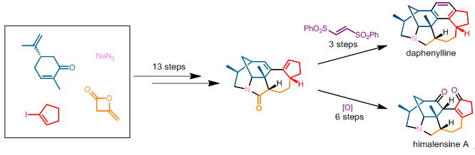 邱發(fā)洋課題組以(S)-Carvone作為手性源,以13步反應合成了一個通用手性中間體,而該中間體是虎皮楠家族中許多成員的共同結(jié)構(gòu)特征。在此基礎(chǔ)上,可以通過組合化學模式合成多種結(jié)構(gòu)特征的虎皮楠生物堿。作為示范,邱發(fā)洋課題組從該中間體出發(fā),分別以3步和6步反應實現(xiàn)了(-)-Daphenylline和(-)-Himalensine A的不對稱全合成。該全合成路線是(-)-Daphenylline分子的全合成中反應步驟最少、產(chǎn)率最高的路線。