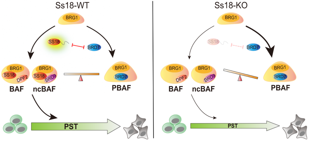 針對SS18的相分離行為是如何調(diào)控多能性退出的具體機(jī)制,科研人員進(jìn)一步展開了深入的機(jī)制研究。已有研究表明SS18蛋白是染色質(zhì)重塑復(fù)合物BAFs的穩(wěn)定亞基。在胚胎干細(xì)胞中,BAFs主要分為三種亞型:經(jīng)典BAF(canonical BAF, cBAF)、非經(jīng)典BAF(non canonical BAF,ncBAF)以及PBAF(Polybromo-associated BAF)。他們含有一些共有成分如SMARCD1以及BCL7A/B/C等,也分別含有其特異性亞基??蒲腥藛T發(fā)現(xiàn),SS18形成的蛋白凝聚體可以富集cBAF特異性亞基而排斥PBAF特異性亞基,從而起到促進(jìn)或抑制相應(yīng)BAF亞型裝配的功能,而不同亞型的BAFs在多能性體細(xì)胞轉(zhuǎn)變中的角色卻不盡相同。因此,SS18蛋白的缺失會(huì)打破BAFs各亞型之間裝配的平衡,并最終影響多能性細(xì)胞-體細(xì)胞轉(zhuǎn)變進(jìn)程。