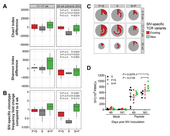 本研究結果發(fā)現(xiàn),預存瘧疾導致動物產(chǎn)生更多的CD4+ CCR5+ T細胞,有利于SIV的復制,從而導致更高的病毒載量。相反,隨后瘧疾感染誘導了更大比例的CD4+ CD28high CD95high中央記憶型T細胞和更強的SIV特異性T細胞反應,并維持SIV特異性T細胞受體庫的多樣性,產(chǎn)生新的SIV特異性T細胞克隆型來追蹤SIV的抗原變異,從而延長SIV感染動物的壽命。