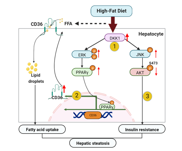 近日,中國科學(xué)院廣州生物醫(yī)藥與健康研究院李尹雄研究員課題組在Life Science Alliance上發(fā)表了題為Hepatic DKK1 driven steatosis is CD36-dependent的研究論文。這項研究闡明了高脂飲食誘導(dǎo)肝內(nèi)DKK1升高進而促進肝脂肪變性的病理基礎(chǔ)。 DKK1通過ERK-PPARγ軸上調(diào)CD36增加脂肪酸攝取,通過上調(diào)JNK信號加劇肝胰島素拮抗,兩者的疊加是DKK1驅(qū)動脂肪肝的關(guān)鍵事件。