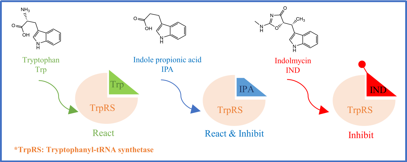 在本研究中,研究人員揭示了IPA對結核菌的新作用機制:IPA可以與結核菌TrpRS結合并干擾其催化活性來發(fā)揮其抑菌作用。TrpRS在細菌中催化兩步反應:第一步通過水解ATP激活色氨酸形成色氨酰-AMP,第二步將活化的Trp轉移到tRNATrp產生Trp-tRNATrp。具體而言,研究團隊通過前期調研發(fā)現(xiàn)使用IPA和結核菌TrpRS抑制劑吲哚霉素篩選的耐藥突變結核菌中都具有相同的基因突變,這引起了研究人員的注意,從而提出IPA作為色氨酸的結構類似物能夠占據(jù)TrpRS的色氨酸口袋發(fā)揮其抑菌作用的假說。