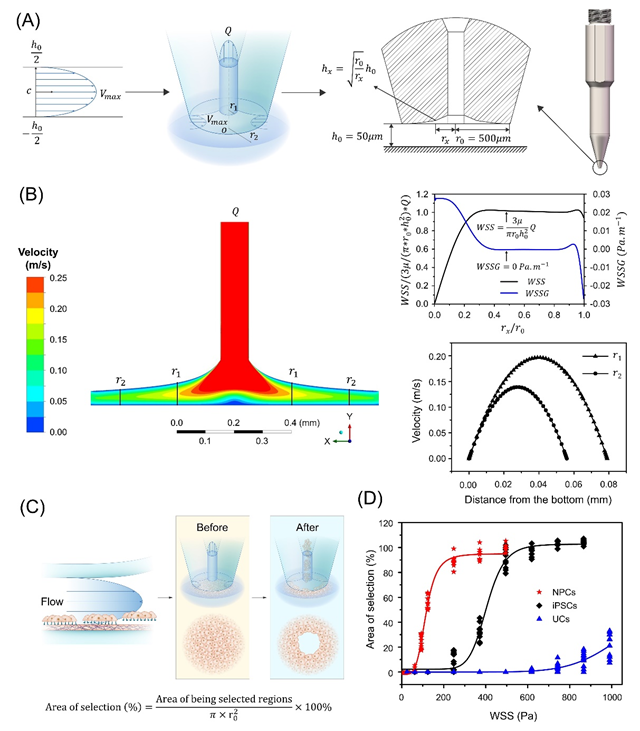 隨后,作者基于流體動力學原理設計了以可以產(chǎn)生局部結(jié)構(gòu)微流體的細胞獲取微型挑針結(jié)構(gòu)(PTMS),機械團隊克服了流場效果與多曲面加工實現(xiàn)的難題,反復校驗加工結(jié)構(gòu),最終基于PTMS產(chǎn)生的結(jié)構(gòu)微流體(PTMS-FLOW)實現(xiàn)了對基于空間限位譜系細胞的特異性挑取。此外,研究證明了PTMS-FLOW可根據(jù)流速變化在Z軸-h0的為常量的條件下,應對不同細胞類型的粘附力差異,實現(xiàn)以無標記、無酶活反應參與、非侵入式、和非接觸的方式對不同譜系細胞進行特異性的選擇。該研究證明了結(jié)構(gòu)微流體是作為分離/選擇特定譜系類型粘附細胞的可自動化的技術(shù)路徑,為后續(xù)進一步研究譜系細胞單克隆的自動化獲取提供了理論基礎(chǔ)(圖2)。
