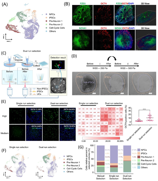 此外,作者團隊借助自動化整機技術(shù)的精確的流體操控能力,設計了一種雙挑模式(Dual?Run?Selection),通過使用兩次不同強度的剪切流體分別獲取不同類型粘附特性的譜系細胞,實現(xiàn)了對特定空間位置的hiPSCs譜系細胞單克隆的特異性選擇(圖3),并能為下游hiPSCs實現(xiàn)特異性擴增提供純化(sub-cloning)能力。