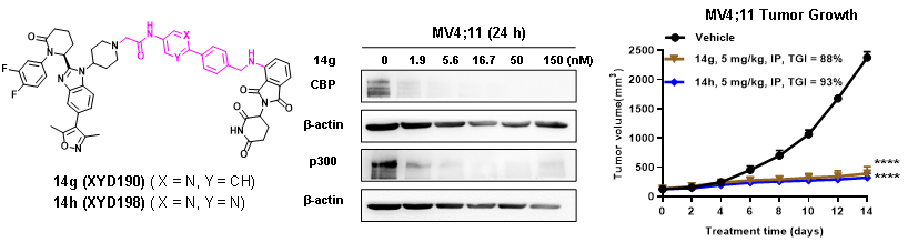 許永團(tuán)隊(duì)長期致力于CBP/p300小分子抑制劑的研究,并獲得了系統(tǒng)性的研究成果(Eur.?J.?Med.?Chem.?2018;Acta Pharmacol.?Sin.?2019;J. Med. Chem.?2022;Bioorg. Chem.?2024)。然而,CBP/p300小分子抑制劑會(huì)面臨兩個(gè)問題:(1)化合物長期暴露會(huì)導(dǎo)致耐藥;(2)化合物單獨(dú)靶向CBP/p300的HAT或BRD域可能無法完全消除其功能。因此,迫切需要一種新的策略,以獲得更有效的治療。