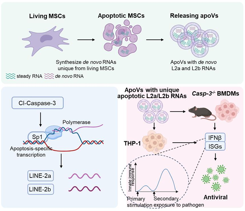 本研究以MSCs為模型,發(fā)現(xiàn)MSCs及其apoVs能夠從頭合成并傳遞凋亡新生RNA的新現(xiàn)象。凋亡MSCs合成與活細(xì)胞不同的特異RNA,包括大量非編碼RNA如轉(zhuǎn)座元件RNA、假基因RNA和miscRNAs等。凋亡MSCs特異轉(zhuǎn)錄的LINE-2a(L2a)和LINE-2b(L2b)RNAs可傳遞至 apoVs進(jìn)一步發(fā)揮功能。研究探索了凋亡MSCs新生RNA依賴于Caspase-3/Sp1/RNA聚合酶II合成的新機(jī)制。研究還發(fā)現(xiàn)攜帶凋亡特異L2a/L2b RNAs的MSC-apoVs通過調(diào)節(jié)先天免疫穩(wěn)態(tài),預(yù)防水皰性口炎病毒(VSV)感染的新功能。