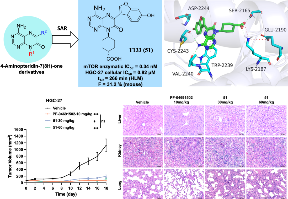 針對(duì)這一挑戰(zhàn),廣州健康院研究團(tuán)隊(duì)通過(guò)精巧的理性藥物設(shè)計(jì),成功開(kāi)發(fā)出一類新型4-氨基蝶啶-7(8H)-酮衍生物作為ATP競(jìng)爭(zhēng)性mTOR抑制劑,其中先導(dǎo)化合物T133(化合物51) 表現(xiàn)尤為突出。通過(guò)構(gòu)效關(guān)系研究和分子模擬,研究揭示了T133分子中的羥基苯并呋喃和反式環(huán)己烷羧酸片段,可通過(guò)與mTOR形成特定的氫鍵和鹽橋相互作用,從而賦予其高親和力(IC50=0.34 nM)與良好的激酶選擇性。