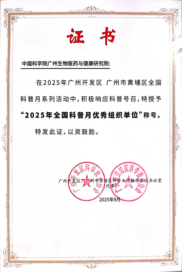 近日,中國(guó)科學(xué)院廣州生物醫(yī)藥與健康研究院(以下簡(jiǎn)稱 “廣州健康院”)憑借在全國(guó)首個(gè)科普月期間的出色組織能力、豐富活動(dòng)形式及顯著社會(huì)成效,獲得黃埔區(qū)授予的“2025年全國(guó)科普月優(yōu)秀組織單位”稱號(hào)。