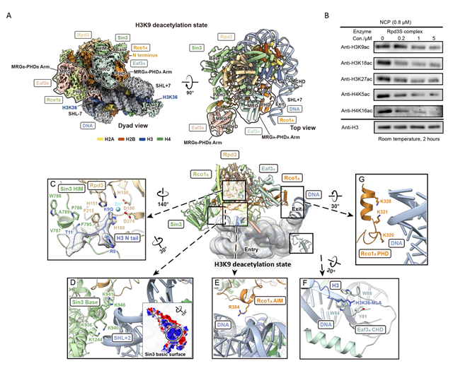 圖1. A:Rpd3S去乙?;?/font>H3K9的cryo-EM電子密度圖及搭建模型圖;B:Rpd3S去乙?;?/font>H3/H4不同賴氨酸殘基的western blotting結(jié)果;C:H3 N端K9Q與Rpd3的酶活中心相互作用圖;D:Sin3 basic surface氨基酸與DNA相互作用圖;E:Rco1 AIM與DNA相互作用圖;F:CHD芳香籠與H3K36me3相互作用圖;G:Rco1 PHD與DNA相互作用圖。