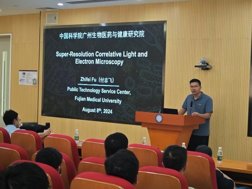 8月8日,福建醫(yī)科大學付志飛研究員應邀到廣州健康院進行學術交流,并向廣州健康院師生作了題為“Super-Resolution Correlative Light and Electron Microscopy”的報告,介紹了超高穩(wěn)定性熒光蛋白mYongHong的開發(fā)工作。本次報告由廣州健康院彭廣敦研究員主持。