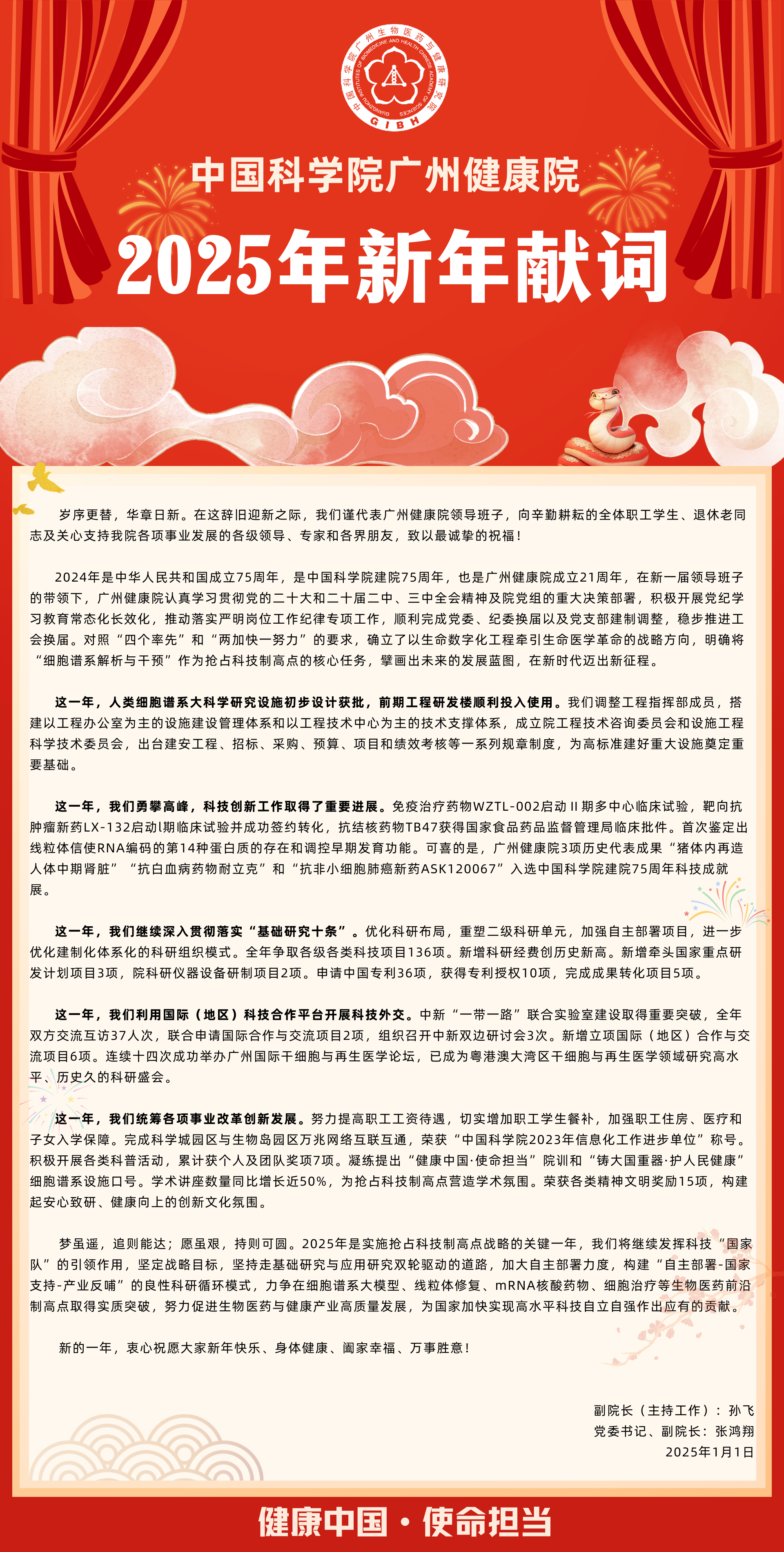 中國(guó)科學(xué)院廣州生物醫(yī)藥與健康研究院(簡(jiǎn)稱“廣州健康院”)于2003年7月由中國(guó)科學(xué)院、廣東省人民政府、廣州市人民政府三方簽約共建,于2006年3月獲得中編辦批復(fù)正式成立。 廣州健康院的定位是:面向人民健康,聚焦生命健康領(lǐng)域前沿重大科學(xué)問題和重要疾病機(jī)理,以建成國(guó)際一流的生物醫(yī)藥與健康領(lǐng)域新型研發(fā)機(jī)構(gòu)和創(chuàng)新人才培養(yǎng)高地為目標(biāo),提供保障人類健康和疾病防控的原創(chuàng)性基礎(chǔ)理論、突破性前沿技術(shù)與系統(tǒng)性解決方案為使命,優(yōu)化科技成果快速轉(zhuǎn)化的機(jī)制與途徑,滿足國(guó)家戰(zhàn)略需求和區(qū)域經(jīng)濟(jì)社會(huì)發(fā)展,促進(jìn)生物醫(yī)藥產(chǎn)業(yè)發(fā)展,發(fā)揮國(guó)家戰(zhàn)略科技力量的核心作用。