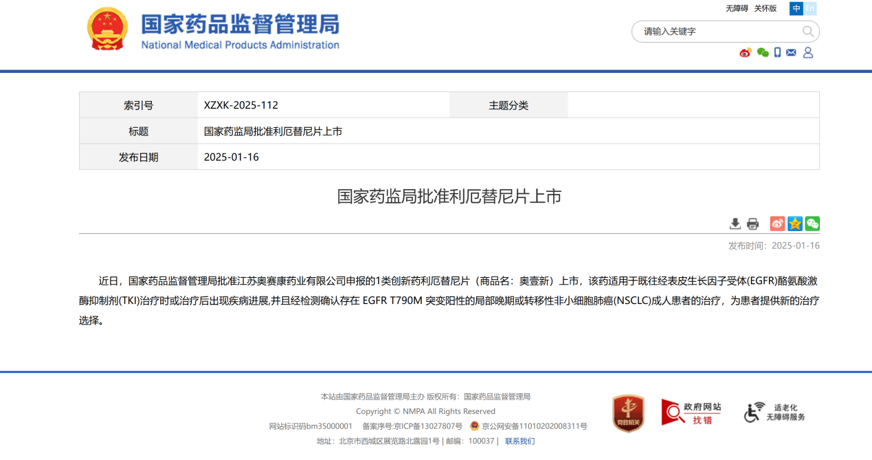 2025年1月16日,中國科學院上海藥物研究所、中國科學院廣州生物醫(yī)藥與健康研究院與江蘇奧賽康藥業(yè)有限公司聯(lián)合自主研發(fā)的1類創(chuàng)新藥利厄替尼片(商品名:奧壹新),正式獲得國家藥品監(jiān)督管理局(NMPA)的上市批準。