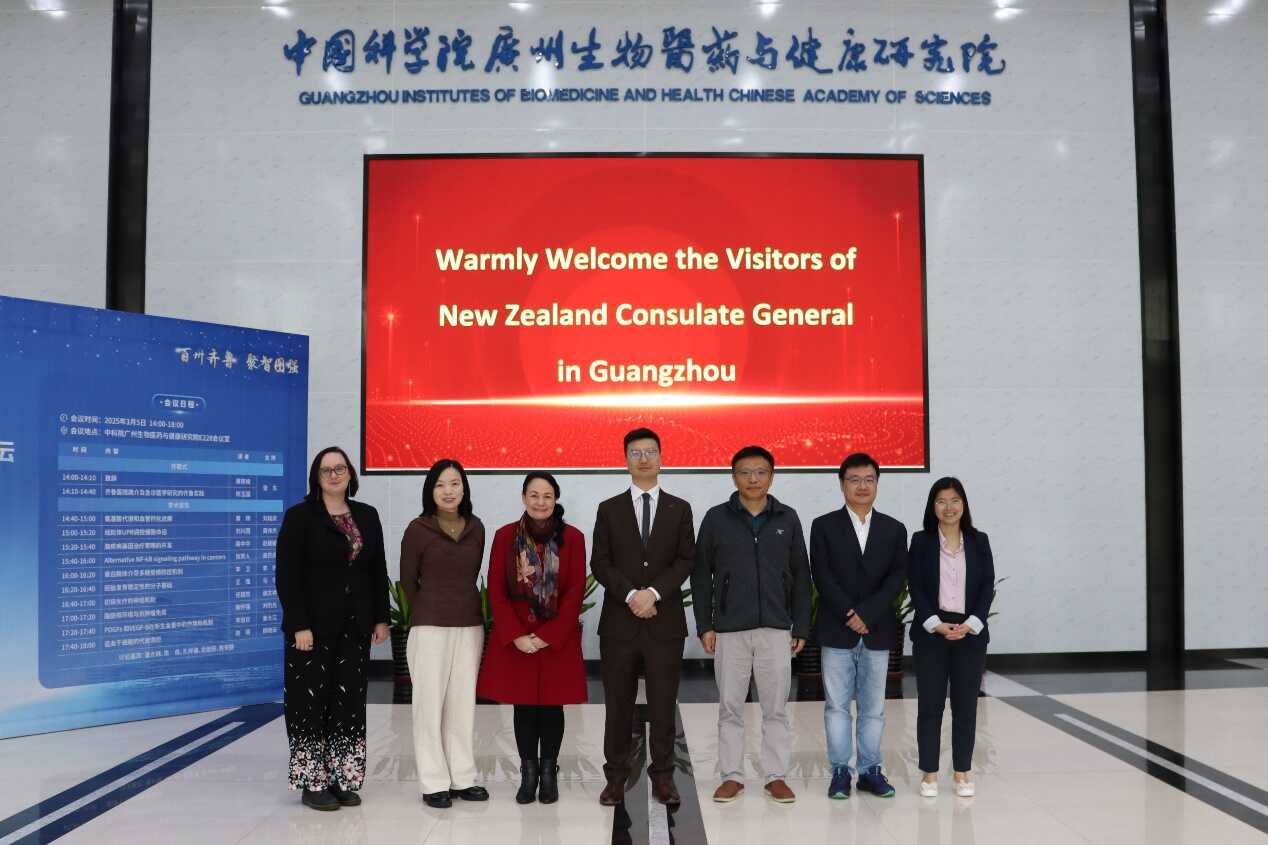 3月5日,新西蘭駐廣州總領(lǐng)事館總領(lǐng)事 Michael Zhang、副總領(lǐng)事 Erina Okeroa、政策顧問(wèn) Serena Zeng 一行到訪中國(guó)科學(xué)院廣州生物醫(yī)藥與健康研究院(以下簡(jiǎn)稱 “廣州健康院”)。雙方就中新國(guó)際科技合作的當(dāng)前進(jìn)展及 2025 年合作規(guī)劃展開(kāi)深入交流探討。