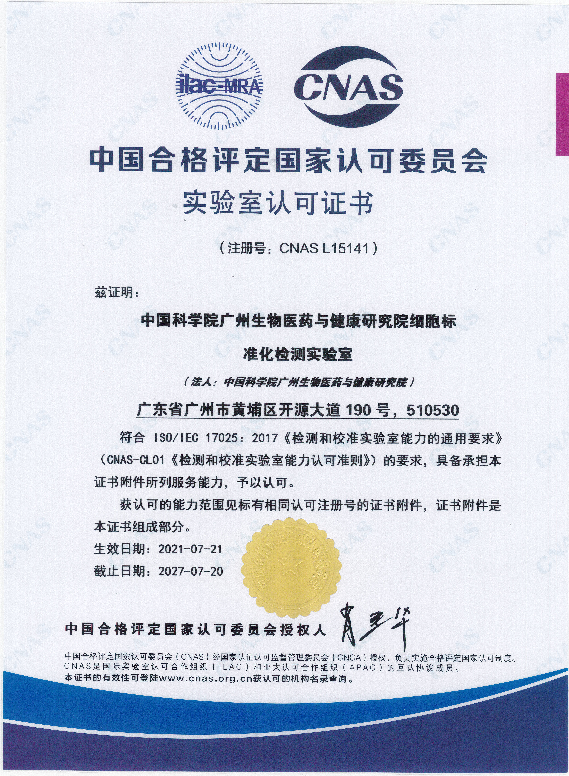 (細(xì)胞標(biāo)準(zhǔn)化檢測(cè)實(shí)驗(yàn)室獲CNAS認(rèn)可證書)