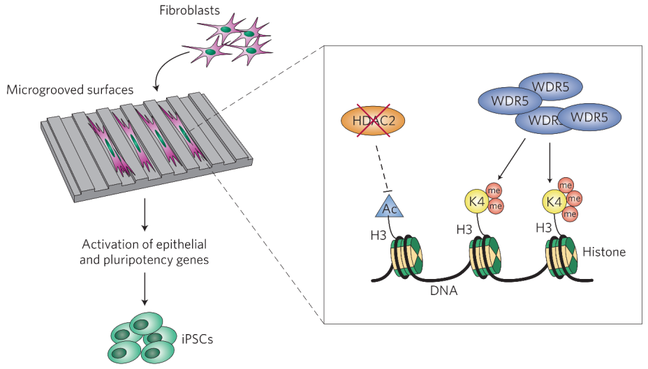 重編程體系的生物物理特性可以通過影響細胞的表觀修飾水平而促進誘導多能干細胞的產(chǎn)生(2013, Nature Materials)。