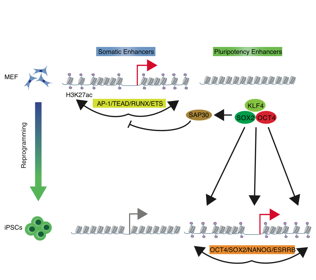 應用ATAC-seq技術(shù)系統(tǒng)分析重編程過程染色質(zhì)開關(guān)圖譜,發(fā)現(xiàn)Sap30可以特異性的調(diào)控染色質(zhì)關(guān)閉狀態(tài)(2017,Cell Stem Cell)。