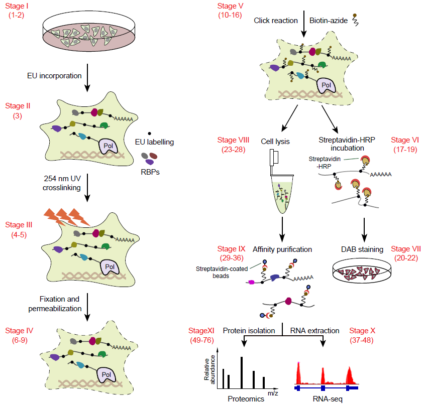 展示捕獲新生RNA結(jié)合蛋白組的工作原理和操作流程(2021,Nature Protocols)