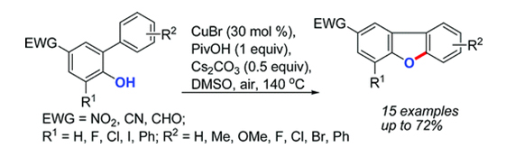 二苯并呋喃是許多活性藥物分子和天然產(chǎn)物的核心結(jié)構(gòu)單元。但是傳統(tǒng)的合成方法存在合成路線長,原子利用率低等諸多缺點。中科院廣州生物院朱強博士研究組利用銅催化的C?H鍵活化方法成功合成了一系列的二苯并呋喃及其衍生物,相關(guān)成果近期發(fā)表在美國化學(xué)會期刊《有機化學(xué)快報》上 (Org. Lett. 2012, 14, 1078–1081.)。