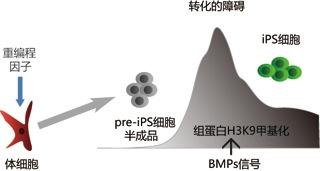 裴端卿研究員及其團(tuán)隊(duì)意識(shí)到這種穩(wěn)定的半成品代表了iPS誘導(dǎo)過(guò)程的一個(gè)重要關(guān)口,大部分細(xì)胞都被阻礙在這個(gè)關(guān)口門(mén)外,于是兵分兩路,一路尋找這種半成品產(chǎn)生的條件,一路探索其轉(zhuǎn)錄調(diào)控情況。經(jīng)過(guò)深入的研究,他們發(fā)現(xiàn)誘導(dǎo)培養(yǎng)iPS細(xì)胞所使用的血清是誘發(fā)這個(gè)障礙的元兇,盡管血清組成成分復(fù)雜,他們依然鑒定出起到主要抑制作用的成分——BMP蛋白,并用嚴(yán)謹(jǐn)?shù)膶?shí)驗(yàn)證實(shí)了BMP信號(hào)通路對(duì)重編程過(guò)程的抑制作用;另一方面,他們發(fā)現(xiàn)一個(gè)奇怪的現(xiàn)象,作為誘導(dǎo)iPS細(xì)胞四個(gè)因子之一的Oct4,盡管在半成品中表達(dá)量也非常高,卻無(wú)法調(diào)控其在胚胎干細(xì)胞或真正iPS細(xì)胞中所調(diào)控的基因,經(jīng)過(guò)檢測(cè),發(fā)現(xiàn)這些Oct4本應(yīng)結(jié)合的位點(diǎn),無(wú)一例外處于一種抑制的表觀遺傳狀態(tài)!這就好比Oct4本該有一些下屬,卻都被鎖在家里,無(wú)法被Oct4調(diào)動(dòng),而這些下屬是否被調(diào)動(dòng),決定著細(xì)胞能否最終建立起多能性。結(jié)合這些結(jié)果,研究人員推測(cè)BMP信號(hào)通路與這個(gè)上鎖的過(guò)程直接相關(guān),并發(fā)現(xiàn)BMP信號(hào)的激活與其中一種稱(chēng)之為H3K9(組蛋白H3上的9位賴(lài)氨酸)甲基化直接相關(guān),這種甲基化一般被認(rèn)為是染色質(zhì)濃縮化形成異染色質(zhì)的標(biāo)志。進(jìn)一步實(shí)驗(yàn)說(shuō)明,BMP信號(hào)通路能夠通過(guò)調(diào)節(jié)H3K9的甲基轉(zhuǎn)移酶來(lái)阻礙細(xì)胞進(jìn)一步前進(jìn)成為iPS細(xì)胞,而維生素C則可以依賴(lài)于H3K9的去甲基化酶清除這種障礙。為了鑒定這個(gè)障礙的重要性及其對(duì)應(yīng)的酶,他們嘗試用siRNA失活各種H3K9甲基化酶,結(jié)果發(fā)現(xiàn),失活Setdb1這個(gè)酶可以使半成品細(xì)胞(pre-iPS細(xì)胞)在96小時(shí)內(nèi)接近100%被繼續(xù)重編程為真正的iPS細(xì)胞,因此Setdb1和H3K9甲基化被證實(shí)是iPS誘導(dǎo)過(guò)程中一個(gè)極其重要的障礙。