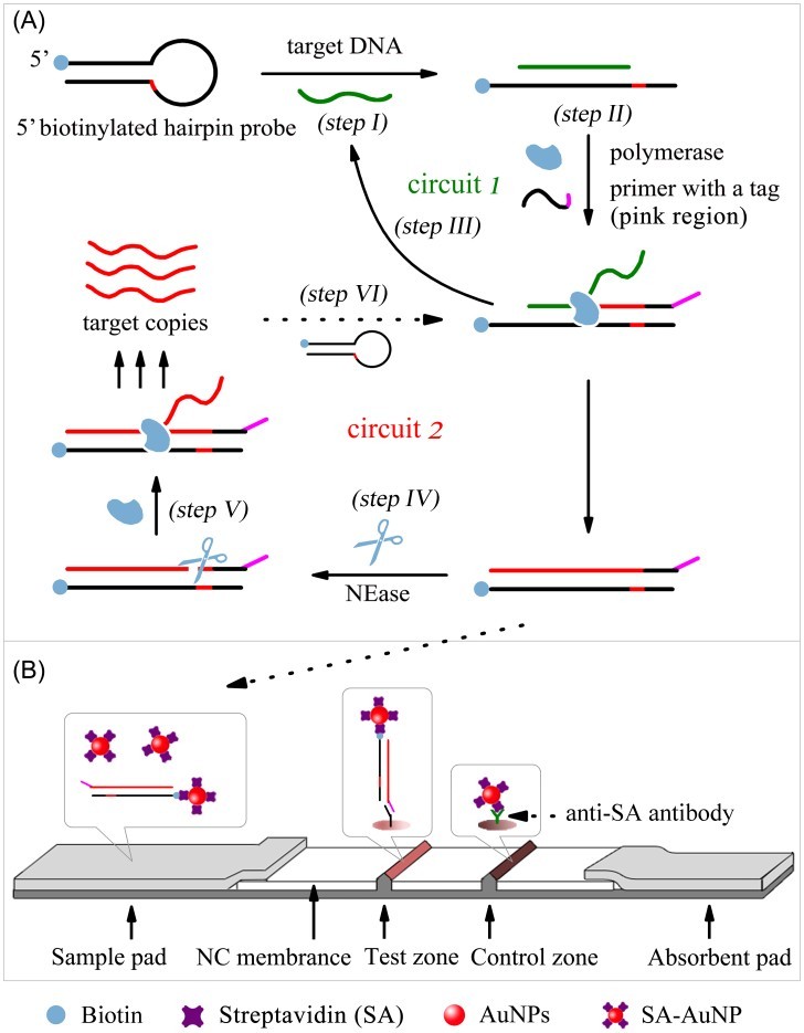 中科院廣州生物醫(yī)藥與健康研究院曾令文研究組基于核酸酶和發(fā)夾DNA探針的等溫信號(hào)擴(kuò)增技術(shù),同時(shí)利用免疫膠體金作為放大顯色系統(tǒng),從而實(shí)現(xiàn)了多重基因分型的目的。當(dāng)有靶標(biāo)核酸存在時(shí),探針識(shí)別靶標(biāo)核酸并與之雜交。該雜交反應(yīng)激活一個(gè)級(jí)聯(lián)的、依賴于聚合酶和切刻酶的信號(hào)擴(kuò)增反應(yīng)系統(tǒng),從而達(dá)到信號(hào)放大的目的。
