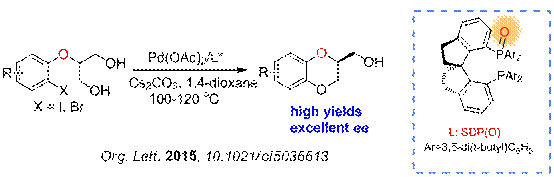 芳基醚和氧雜芳環(huán)是許多天然產(chǎn)物以及重要藥物分子中的關(guān)鍵結(jié)構(gòu)。過渡金屬催化的偶聯(lián)反應(yīng)是合成這類結(jié)構(gòu)的重要方法。盡管目前Pd催化的芳基C-O偶聯(lián)反應(yīng)取得了很大的進(jìn)展,但光學(xué)選擇性的芳基C-O偶聯(lián)反應(yīng)并未引起廣泛的關(guān)注。主要是因?yàn)檫@類反應(yīng)中,化學(xué)鍵形成于SP2雜化的芳基碳原子與氧原子之間,成鍵過程不直接涉及到中心手性的產(chǎn)生。并且對于Pd催化的C-O偶聯(lián)反應(yīng),特別是芳基鹵化物與一級或二級醇類化合物的偶聯(lián)反應(yīng),存在競爭性的b-H消除以及脫鹵等副反應(yīng),使偶聯(lián)反應(yīng)的收率偏低,應(yīng)用受到很大限制。