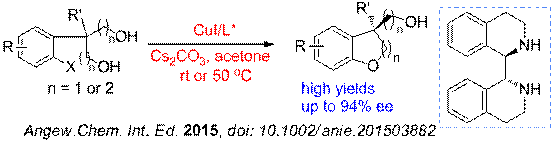 近期,課題組采用CuI/手性環(huán)狀二胺催化體系,成功地克服了鈀催化體系中的一些缺點(diǎn),以高光學(xué)選擇性、高收率實(shí)現(xiàn)了不對(duì)稱去對(duì)稱化芳基C-O偶聯(lián)反應(yīng)構(gòu)建手性苯并2,3-二氫呋喃、苯并二氫吡喃結(jié)構(gòu)。并且通過(guò)這一催化體系,可以高光學(xué)選擇性地構(gòu)建全碳四級(jí)手性中心。