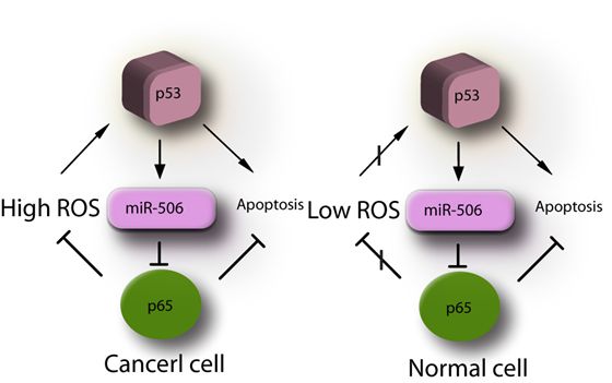 microRNAs(miRNAs)是一類內(nèi)源的長度大約為22nt的小RNA分子,目前在人類中發(fā)現(xiàn)了兩千多個成熟的分子。研究表明,人類基因組編碼miRNAs的區(qū)域只占到約2%-3%,但根據(jù)預測這些卻調(diào)控了約60%的人類蛋白編碼基因。miRNA調(diào)控的多靶點特性使其在腫瘤治療中更加具有優(yōu)勢:一個miRNAs可以調(diào)控同一腫瘤細胞的不同通路及不同腫瘤細胞的不同通路。通過對促進肺癌細胞凋亡的miRNAs篩選,張必良實驗組得到了能夠顯著促進肺癌細胞凋亡的miR-506,進一步發(fā)現(xiàn)miR-506可以通過調(diào)控NF-κB p65特異地在腫瘤細胞中提高細胞的ROS水平并激活p53通路,對肺癌細胞有顯著的選擇性殺傷,而對正常細胞系影響較微。上述結果表明肺癌細胞較正常細胞依賴NF-κB活性來進行氧化還原適應,因此在腫瘤細胞中降低NF-κB p65的表達能增強發(fā)癌癥特異的氧化應激,增加癌細胞ROS水平激活p53蛋白,從而導致選擇性殺傷癌細胞。