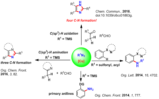 朱強課題組在對銅催化胺化反應研究的基礎上(Org. Lett., 2014, 16, 4702; Org. Chem. Front., 2014, 1, 777.),發(fā)展了一類通過銅媒介的2-芐基吡啶或α-取代苯乙酮衍生物、醛和三甲基硅基疊氮的“一鍋法”反應,合成吡啶并咪唑或三取代咪唑類化合物的新方法。該反應以sp3 C-H 鍵的疊氮化或者胺化反應為關鍵步驟,高效的構建三個或四個C-N鍵。通過與暨南大學李娟課題組合作,對反應的機理進行了DFT(Density functional theory密度泛函理論)計算,計算結果與朱強課題組的實驗結果相吻合,進一步驗證了朱強課題組提出的反應機理。