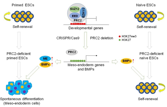 課題組通過構(gòu)建可誘導性敲除PRC2的人胚胎干細胞,確認BMPs蛋白激活是PRC2缺失引起人胚胎干細胞自發(fā)分化的原因。課題組進一步展示缺失PRC2的小鼠胚胎干細胞可以維持自我更新狀態(tài),但轉(zhuǎn)變成始發(fā)狀態(tài)的小鼠上胚層干細胞發(fā)生自發(fā)分化;將人胚胎干細胞轉(zhuǎn)變成幼稚態(tài)時,發(fā)現(xiàn)缺失PRC2可以維持其多能性狀態(tài)。以上結(jié)果揭示PRC2在細胞命運決定過程中譜系特化和不同多能性狀態(tài)的特異性作用,對人胚胎干細胞是否能向整個外胚層譜系分化起決定作用,并在維持naive(幼稚態(tài))和primed(始發(fā)態(tài))兩種狀態(tài)的胚胎干細胞多能性發(fā)揮不同作用。