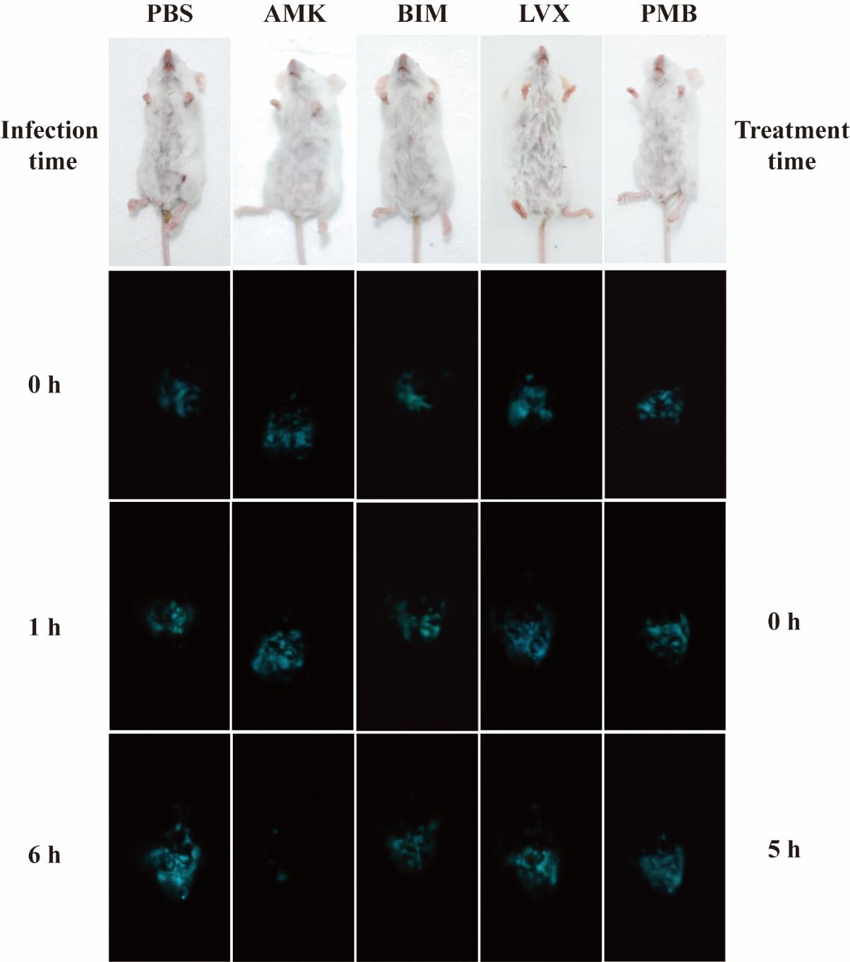 圖1、自主發(fā)光銅綠假單胞菌感染小鼠采用不同藥物治療后活體成像?