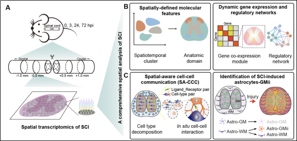 2024年7月18日,中國科學(xué)院上海有機(jī)化學(xué)研究所生物與化學(xué)交叉研究中心方燕姍課題組、中國科學(xué)院廣州生物醫(yī)藥與健康研究院彭廣敦課題組和暨南大學(xué)李昂課題組合作,在Developmental Cell期刊在線發(fā)表了題為“A spatiotemporal molecular atlas of mouse spinal cord injury identifies a distinct astrocyte subpopulation and therapeutic potential of IGFBP2”的最新論文。該研究利用空間轉(zhuǎn)錄組技術(shù)對急性損傷引起的脊髓中分子和細(xì)胞水平的復(fù)雜變化進(jìn)行了全面深入的梳理和分析,通過刻畫脊髓損傷?(spinal cord injury, SCI)后基因表達(dá)和分子變化的時空特征,以及繪制原位細(xì)胞互作網(wǎng)絡(luò)圖譜識別出一類發(fā)生特定位置遷移的星形膠質(zhì)細(xì)胞亞群,并鑒定出該亞群的特征基因之一Insulin-like growth factor binding protein 2?(Igfbp2),進(jìn)而揭示了SCI引起Igfbp2表達(dá)上調(diào)的細(xì)胞功能和潛在生物學(xué)意義。