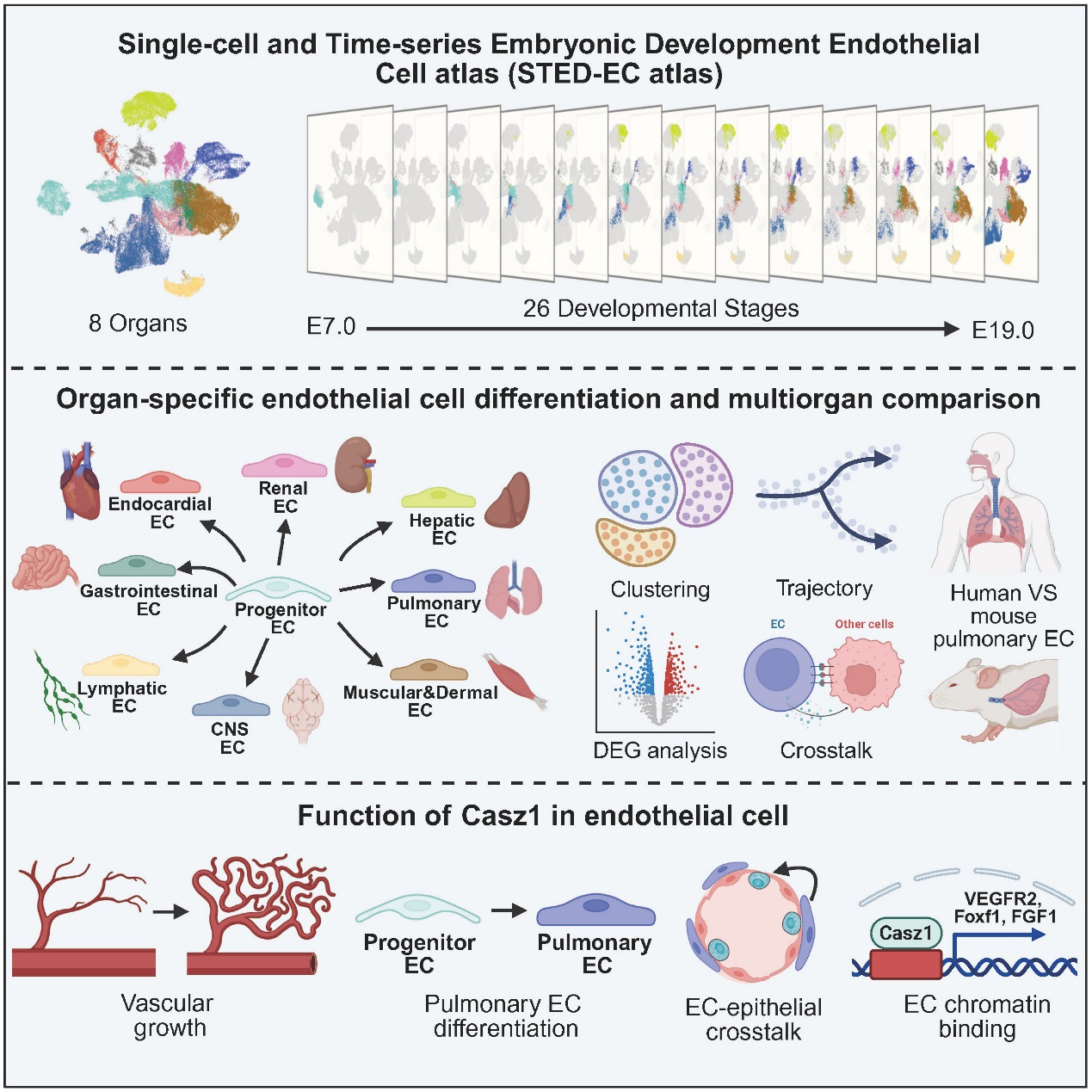 2月17日,中國(guó)科學(xué)院廣州生物醫(yī)藥與健康研究院、華南理工大學(xué)、廣州國(guó)家實(shí)驗(yàn)室和西湖大學(xué)聯(lián)合團(tuán)隊(duì)在?Cell?發(fā)表題為 A single-cell time-series atlas of endothelial cell embryonic development 的研究論文。通過(guò)構(gòu)建小鼠內(nèi)皮細(xì)胞胚胎發(fā)育全程的譜系圖(http://sted-ec.ccla.ac.cn/),發(fā)現(xiàn)血管內(nèi)皮細(xì)胞在小鼠胚胎發(fā)育的孕中期,開(kāi)始分化并逐步建立適配各個(gè)器官的內(nèi)皮細(xì)胞。肺血管內(nèi)皮富集基因Casz1影響肺血管生長(zhǎng)、器官特異性分化和肺部的內(nèi)皮-上皮的細(xì)胞互作。