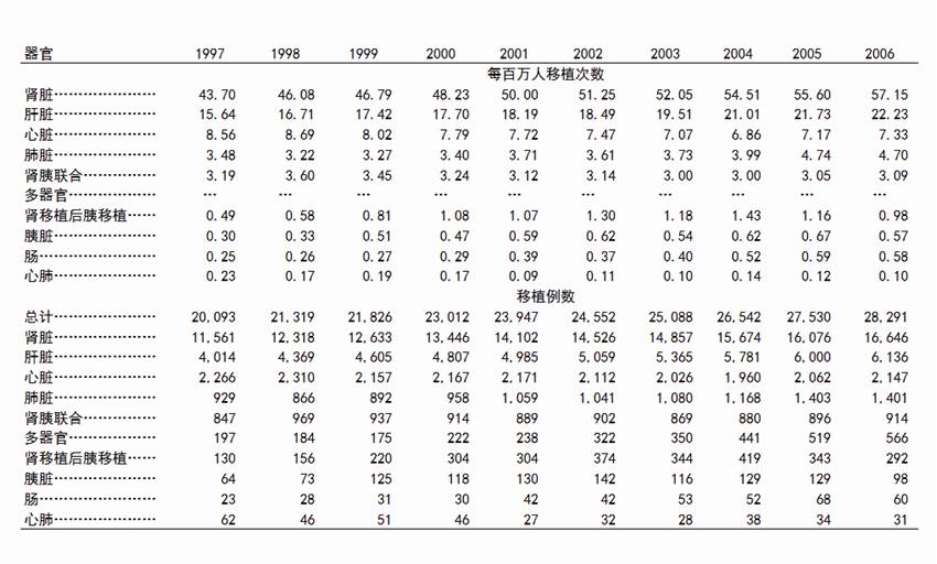 美國1997-2006年每百萬人各器官移植次數(shù)和移植例數(shù)