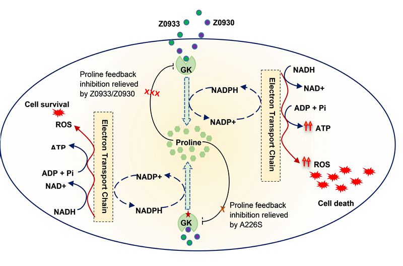 目前靶向篩選抗TB藥物研發(fā)的策略幾乎都是尋找Mtb關(guān)鍵代謝酶的抑制劑。近日,中國科學(xué)院廣州生物醫(yī)藥與健康研究院團(tuán)隊(duì)聯(lián)合廣州市胸科醫(yī)院(劉健雄等)、深圳市第三人民醫(yī)院(黃乃淇)及奧爾巴諾瓦大學(xué)中心KTH皇家理工學(xué)院(周洋)等單位合作發(fā)現(xiàn)谷氨酸激酶(glutamate kinase, GK)可能成為抗TB藥物的新靶標(biāo)。新的喹啉類化合物Z0930/Z0933(專利已授權(quán)ZL 201310385431.X)以前藥的形式起作用。其活性形式通過與脯氨酸競爭結(jié)合GK增強(qiáng)而非抑制GK的活性,可以破壞脯氨酸合成通路的反饋抑制,進(jìn)而影響電子傳遞鏈,導(dǎo)致產(chǎn)生過多的活性氧(reactive oxygen species , ROS),從而殺死Mtb。突變的GK活性不受化合物Z0930/Z0933的影響,從而導(dǎo)致Mtb可以忍受較高濃度這類化合物。GK的突變點(diǎn)A226S可能位于Z0930/Z0933結(jié)合位點(diǎn)(圖1)。本研究首次報(bào)道了小分子增強(qiáng)而不是抑制代謝酶的活性可成為潛在抗結(jié)核藥物的新策略。相關(guān)研究成果以“Quinoline derivatives kill Mycobacterium tuberculosis by activating glutamate kinase”為題于2019年6月14日在線發(fā)表于Cell系列子刊Cell Chemical Biology。