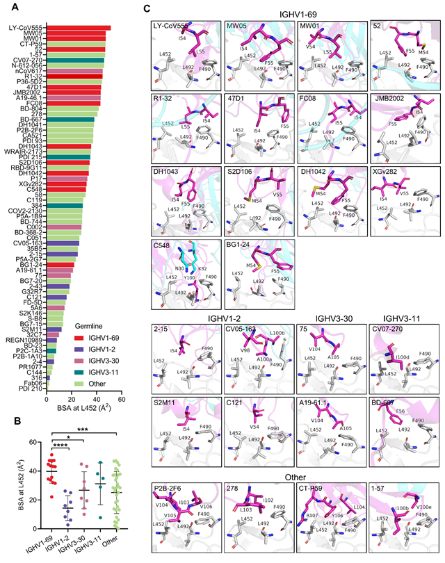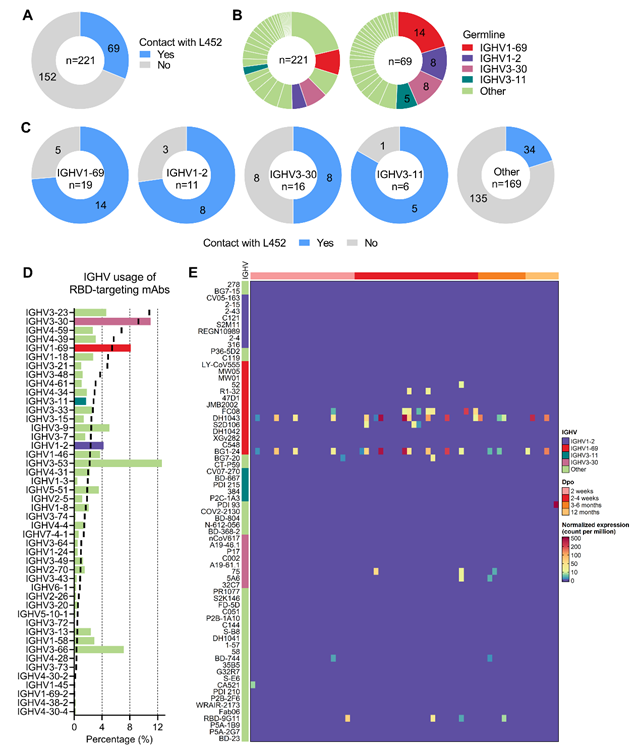 前期廣州健康院陳凌、熊曉犁、何俊、陳新文等團(tuán)隊(duì)合作從新冠康復(fù)者中分離單克隆抗體并利用抗體組庫分析發(fā)現(xiàn)新冠感染和疫苗接種人群中廣泛存在一類由IGHV1-69編碼的中和抗體,被命名為類R1-32抗體譜系。類R1-32抗體靶向病毒蛋白受體結(jié)合域(RBD)半隱藏表位,通過打開刺突蛋白并將其瓦解的方式阻止病毒進(jìn)入細(xì)胞。L452R單點(diǎn)突變能夠顯著降低類R1-32抗體的親和力和中和活性,提示L452R具備逃逸群體抗體的能力。因此,研究人員推測人群中廣泛存在的IGHV1-69抗體是L452R突變形成的關(guān)鍵驅(qū)動力。為了證實(shí)這一猜想,本研究首先分析了當(dāng)前能夠獲取到的221株解析了結(jié)構(gòu)的新冠人源單克隆抗體,發(fā)現(xiàn)其中超過三分之一與L452位點(diǎn)存在相互作用。進(jìn)一步分析發(fā)現(xiàn)這些能夠與L452發(fā)生相互作用的單克隆中和抗體主要是由IGHV1-69,IGHV1-2,IGHV3-30和IGHV3-11基因編碼。然而,抗體組庫分析發(fā)現(xiàn)只有IGHV1-69編碼的L452靶向抗體廣泛存在于新冠感染人群中(圖1)。