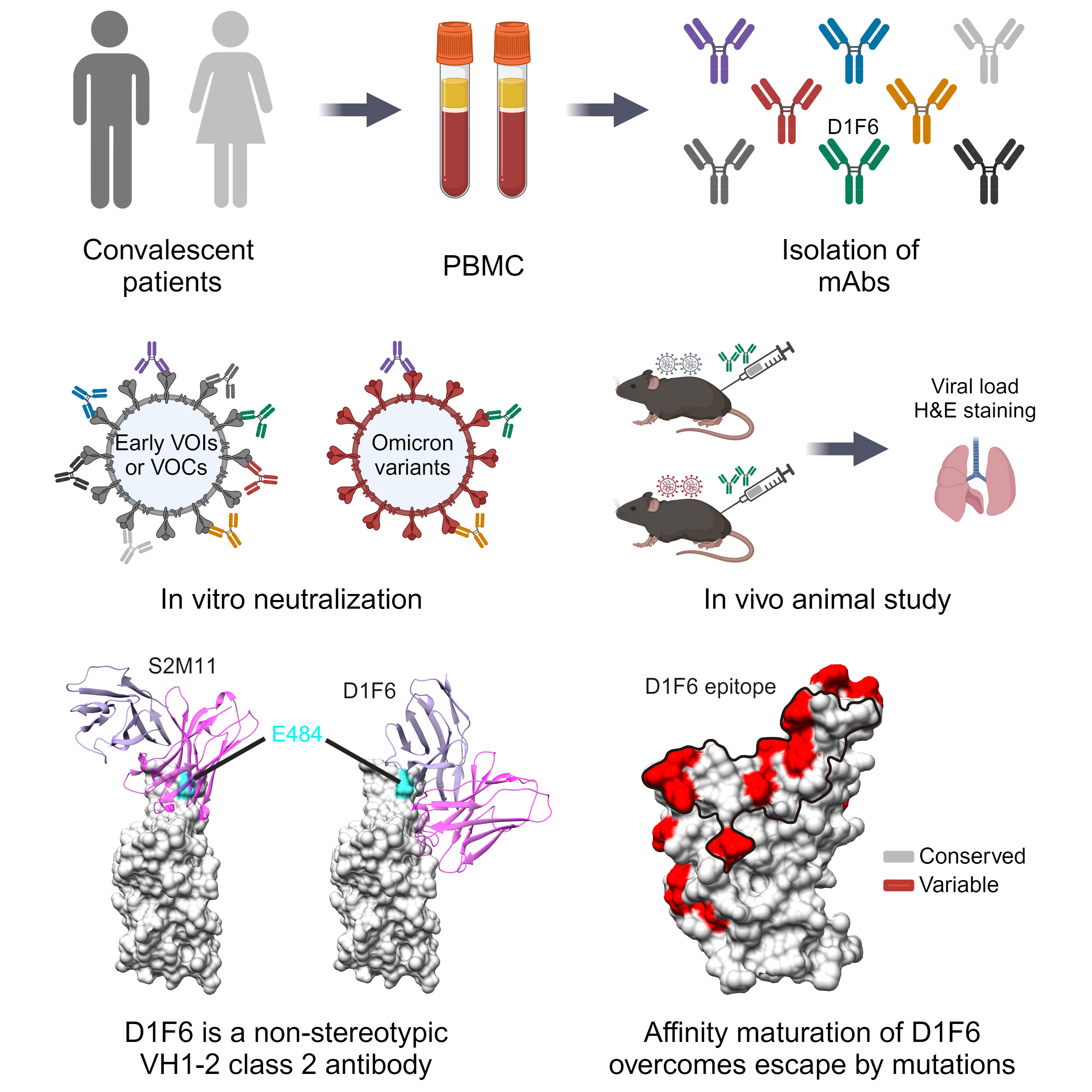 面對自然感染和疫苗接種產(chǎn)生的免疫壓力,新冠病毒持續(xù)進化和變異,逃逸了絕大部分早期篩選獲得的中和抗體。其中,在人群中被廣泛誘導(dǎo)的VH1-2基因編碼抗體被認(rèn)為在新冠病毒早期的抗體免疫中起到了關(guān)鍵作用,但由于新冠病毒刺突蛋白E484K/A的突變,大多數(shù)VH1-2類抗體被逃逸。在該研究中,研究人員從早期新冠病毒野生株感染者中篩選到一株由VH1-2基因編碼的中和抗體D1F6。不同于其他已知的VH1-2抗體,D1F6不被攜帶E484A突變的Omicron變異株逃逸,對Omicron變異株的多種亞型仍保持高效中和活性。動物實驗結(jié)果表明D1F6可以有效抑制Delta和Omicron?BA.5、XBB.1.5、EG.5.1等變異株在小鼠體內(nèi)的復(fù)制。