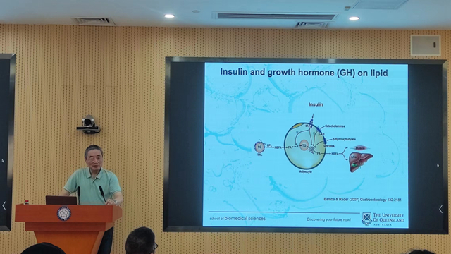 陳晨以“Academic Career in a Rapidly Changing World”為主題,結(jié)合他的教育經(jīng)歷、工作經(jīng)歷,講述其在代謝調(diào)節(jié)、生長(zhǎng)激素、糖尿病、肥胖、內(nèi)分泌相關(guān)腫瘤等領(lǐng)域的研究和個(gè)人心得體會(huì)。此外,他還結(jié)合實(shí)驗(yàn)案例,為在座學(xué)生講解飲食與激素、代謝、肥胖之間的關(guān)聯(lián),不同年齡、不同性別的代謝和生長(zhǎng)激素的差異等。